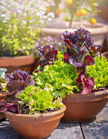 Close-up of lettuce salad crops growing in terracotta pots on a patio