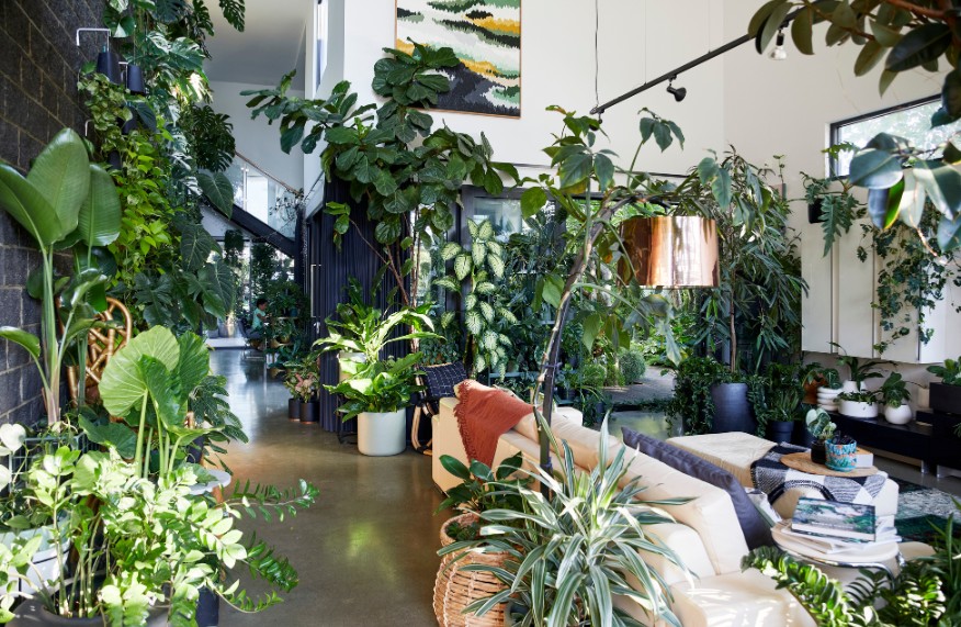 The garden continues inside, where up to 500 plants bring life and vibrancy to each room. “I like to bring what you’d normally see outside inside,” says Fesi. “A shade-loving tree like a ficus looks common outside, but when you bring a 3–4m tree inside, that’s really special.”