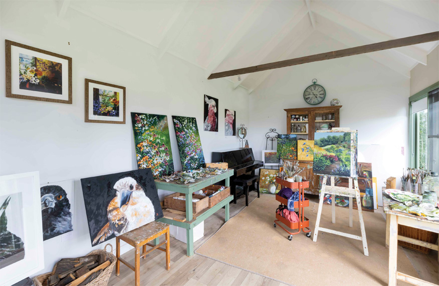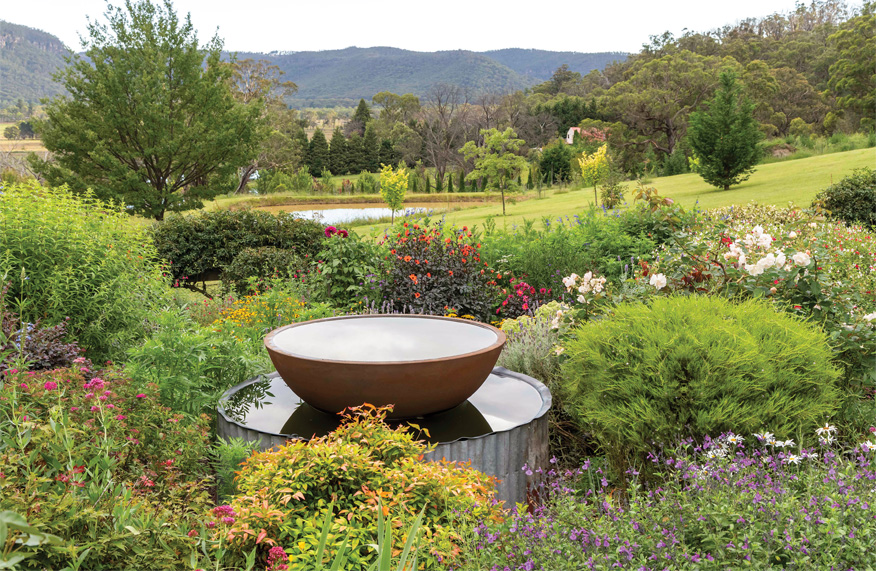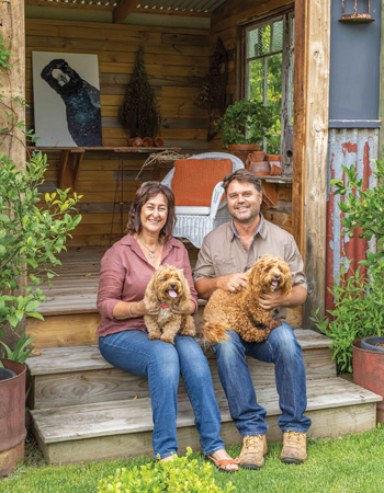 There was no dwelling on the property so, first up, licensed builder Pete built them a house (a “glamorous shed”), a guest cottage and an art studio for Jennifer. He then landscaped a walled garden, arbours, a potager, water features and a hothouse, using stone and timbers and a plethora of recycled materials. A statement water fountain comprises reused tin while an arbour-like structure called a tonnelle is made from rusty iron from a Southern Highlands antique shop. “The combination of rustic buildings dressed with recycled timbers, retaining walls of old railway sleepers, repurposed stone edges, old water tanks and vintage carts give the impression that the property is much older than it actually is,” Jennifer says. “We wanted a nod to the history of [local village] Hartley.”