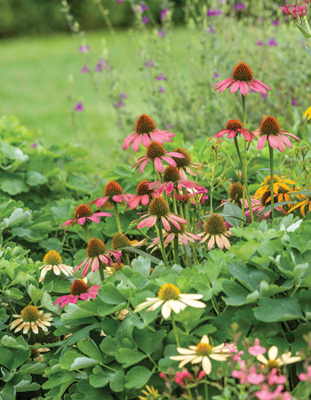 | FEATURE TREES – Japanese maple (Acer palmatum) – Canadian maple (A. rubrum) – Flowering plum (Prunus cerasifera ‘Nigra’) – Cercis canadensis ‘Forest Pansy’ – Ginkgo biloba – Golden elm (Ulmus glabra ‘Lutescens’) – Crabapple (Malus ioensis) – Pears: snow pear (Pyrus nivalis), P. calleryana ‘Capital’ and Manchurian (P. ussuriensis) PERENNIALS – California poppy (Eschscholzia californica) – Lupinus spp. – Persicaria spp. – Dahlias: ‘Cafe Au Lait’, Mystic ‘Haze’, ‘Little Swan’ and ‘Bishop of Llandaff’ – Rudbeckia spp. – Aquilegia spp. – Penstemon spp. – Sedums – Sedum album and Hylotelephuim spectabile ‘Autumn Joy’ (syn. Sedum spectabile) ANNUALS – Cosmos spp. – Poppies: Flanders poppy (Papaver rhoeas) and the cultivars ‘Pandora’, ‘Lilac Pom Pom’ – Foxgloves (Digitalis spp.) – Marigolds (Tagetes spp.) – Zinnia spp. |
